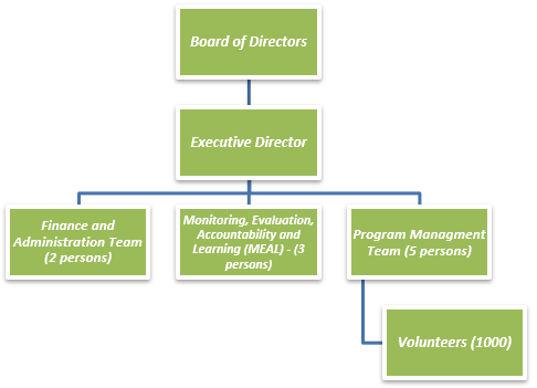 There are three persons who serve CSDS as a Monitoring, Evaluation, Accountability and learning (MEAL) team. The operational management of the organization is looked after by Executive Director of the organization. The director also serves as secretary to the board. The Executive Director is supported by finance and administration team and program management team. The organization also has Monitoring, Evaluation, Accountability and Learning (MEAL) section. CSDS has ten full time and part staff members. The organization chart below explains governance and management structure of the organization.